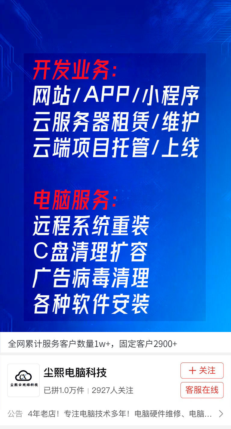 尘熙云网络科技旗下的尘熙电脑科技部门专注于远程电脑系统重装和C盘清理扩容、广告病毒、流氓软件清理、破解软件安装、开发网站程序和应用等服务!